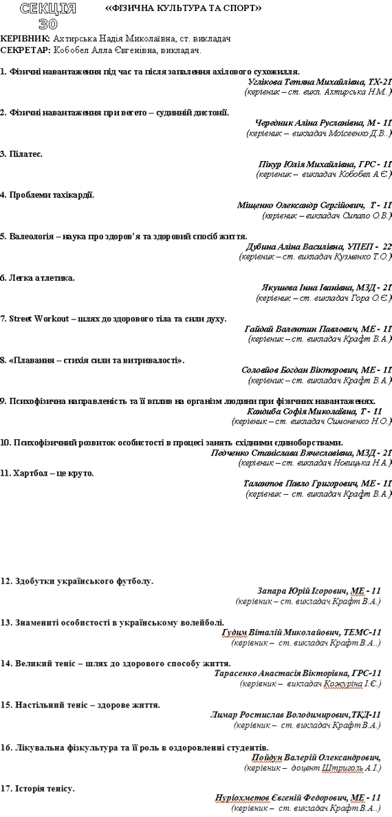 - «Розвиток стрибкових якостей у волейболістів» - Д’яконенко Дмитро Юрійович – БТ-31 (керівник – ст. викладач Васецький І.А.)
